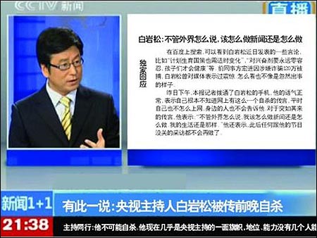 另一位不愿透露姓名的主持人告知本報(bào),“他不可能自殺,即使自殺了,這事也會(huì)被捂下去。因?yàn)榘讕r松現(xiàn)在幾乎是央視主持的一面旗幟,地位、能力沒(méi)有幾個(gè)人能比?!?/strong>