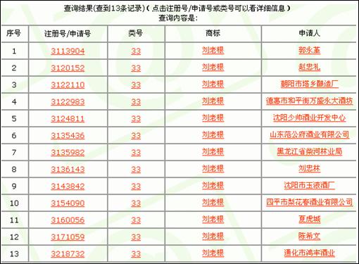 順便讓大家看看,在33類酒制品上搶注“劉老根”的情況。