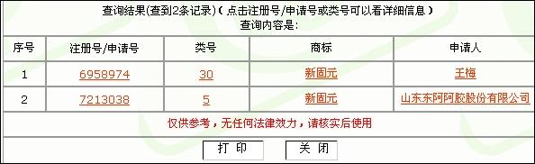 首先說商標(biāo),“馬悅凌”有四家單位包括個人注冊,誰出的難以確認(rèn),而“馬醫(yī)生”筆者查詢后發(fā)現(xiàn)有申請記錄但是看不到具體信息。那就查查“新固元”,結(jié)果如下:
