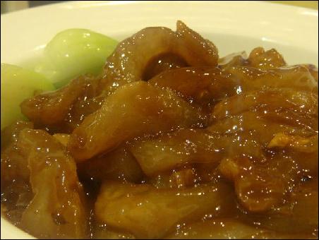 老婆對(duì)作菜還是很有悟性,她吃過(guò)這蹄筋之后就說(shuō),我也會(huì)做。不就是和做糖醋排骨差不多嗎?先煮,然后往上一澆汁變OK了。于是,沒(méi)過(guò)幾天,老婆就將自制的紅燒蹄筋做好了。雖說(shuō)和便宜坊的還是有不小的差距,但是味道也還是不錯(cuò)的,因?yàn)槲抑肋@是好東西,所以我一人就干了一大盤。這東西,簡(jiǎn)直就是高蛋白,幾乎無(wú)脂肪的好東西。