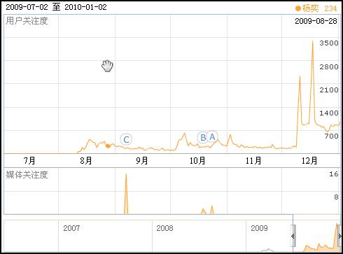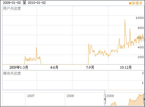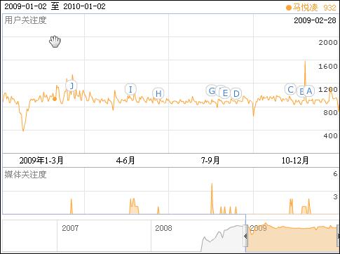 2009年,馬悅凌的百度用戶關注度指數(shù)持續(xù)在900多點高位