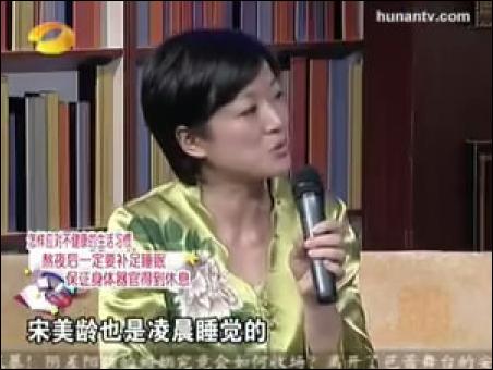 【byb.cn XJ】 2010年1月13日,有“健康教母”之稱的馬悅凌,在做客湖南衛(wèi)視百科全說欄目時,拋出了相當(dāng)雷人的觀點--熬夜沒事,只要你補足了覺就行,只要你吃好了就行。同時,她現(xiàn)身說法,說自己經(jīng)常在凌晨1-2點才睡,第二天上午睡到自然醒,啥事沒有。并且舉出毛澤東、宋美齡也經(jīng)常的熬夜來證明其觀點的正確。
