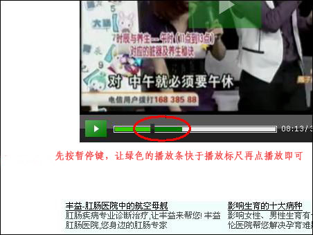 如果你在收看視頻的時(shí)候,感覺很卡,說明同時(shí)在線的訪問的人多,你如果一定要在這個(gè)時(shí)間段看,可以在播入一段后,按暫停鍵,讓進(jìn)度條多走一段,等大大超過了進(jìn)度標(biāo)尺后,再行播放,就會(huì)很流暢。