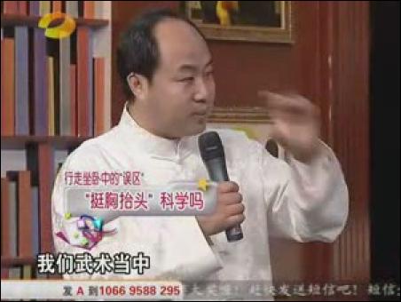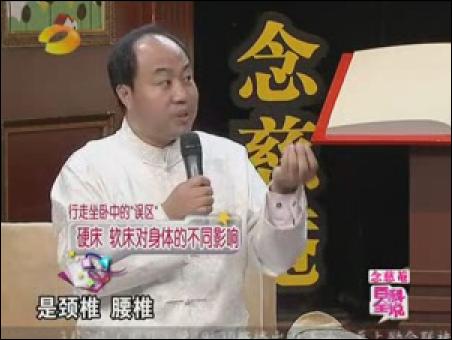 名醫(yī)胡國忠一上臺就批評主持人方瓊穿高跟鞋過度,小腿和大腿之間的腳踝處(委中穴)有明顯的腫塊。名醫(yī)說:“女性穿高跟鞋,每天最好別超過3個小時”不僅如此,名醫(yī)還批評睡軟床的年輕人。名醫(yī)說:“年輕人最好睡硬板床,對身體有好處?!闭劦阶危t(yī)推薦坐太師椅,稱太師椅符合人體結(jié)構(gòu)。并在《百科全說》節(jié)目現(xiàn)場,親自示范如何正確坐太師椅。