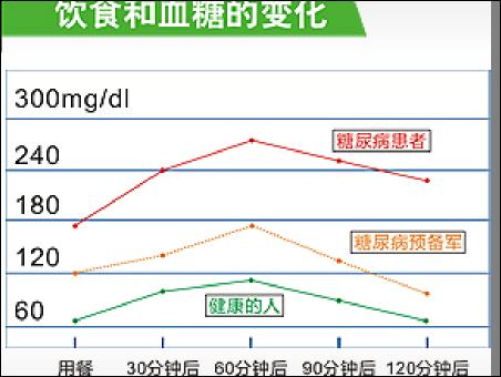 用餐后血糖會(huì)暫時(shí)升高,但身體會(huì)控制不讓血糖高過140mg/dl (7.8mmol/L),餐后2小時(shí)胰島素會(huì)讓血糖下降至原本值,但若胰島素分泌過少,血糖則很難下降。(測(cè)試血糖時(shí),應(yīng)當(dāng)綜合以上情況,周期性的進(jìn)行血糖測(cè)量。)