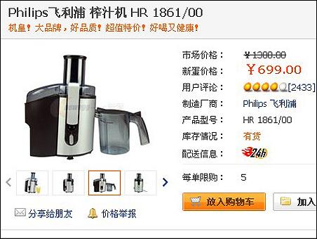 【byb.cn】好消息,飛利浦1861榨汁機(jī)現(xiàn)在已經(jīng)跌至700元以下,由于新蛋和京東兩家大型的電子商務(wù)網(wǎng)站商品價(jià)格一直相互血拼,導(dǎo)致這款高性能的榨汁機(jī)價(jià)格持續(xù)下降,目前價(jià)格已經(jīng)跌到699元了。比前一段時(shí)間的775元,又便宜不少,機(jī)會(huì)難得,這是近幾個(gè)月來的最低價(jià),需要的朋友,請抓緊時(shí)間購買。