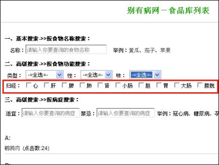 ②高級查詢一,按食物的“性味歸經(jīng)”查。