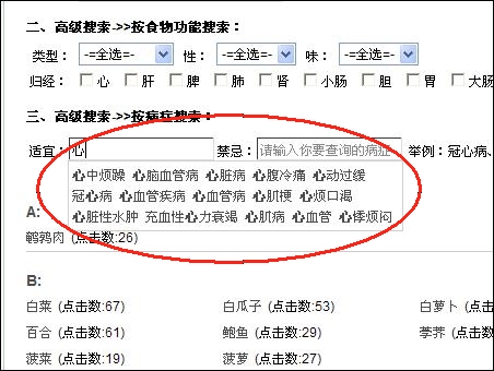 ?、?strong>高級查詢功能二,按適宜、禁忌查。很多網(wǎng)友現(xiàn)在得的病的名稱,都是西醫(yī)的名稱,叫的也不規(guī)范,比如,高血壓,也可稱為血壓高,也可稱為心腦血管病,但不管你叫什么,只要你輸入一個關(guān)鍵字,系統(tǒng)就會自動提示你在本庫中的相關(guān)的病名,你點中想要查的病就行了。