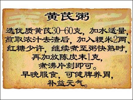 方法:選優(yōu)質(zhì)黃芪30 -60克,加水適量,煎取濃汁去渣后,加入粳米2兩、紅糖少許,繼續(xù)煮至粥快熟時(shí),再加放陳皮末1克,煮沸片刻即可。早晚服食,可健脾養(yǎng)胃,補(bǔ)益元?dú)狻?/p>