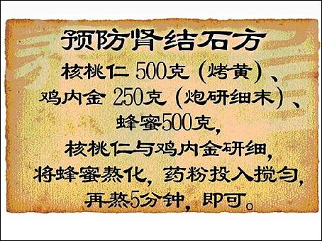 腎病病人的吃鹽就很有講究,鹽吃多了會水腫,吃得不夠也會水腫。喝水喝得太硬了,就會造成腎結(jié)石。我們北方的水質(zhì)都偏硬,水堿比較多,因此預(yù)防腎結(jié)石很必要,針對這個特點羅宗美大夫給大家介紹一個預(yù)防和緩解腎結(jié)石的方子: