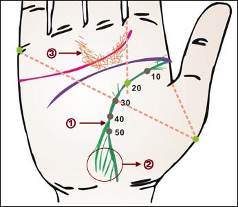 在四十五歲點(diǎn),生命線分兩道下行,表示下半身較弱。由于血行不暢及貧血。天氣轉(zhuǎn)寒或入冷氣受涼易發(fā)下肢痛和腰痛,需善為保護(hù)。生命線末端分岔,是未來(lái)體力衰退之兆,宜注意日常營(yíng)養(yǎng)補(bǔ)給,改善貧血。金星帶有小縱線叢集,是婦科障礙線,注意節(jié)制性生活。