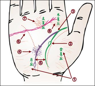 感情線多起伏,呈波狀,末端抵于木星丘,數(shù)條分岔。這是感情豐富,神經(jīng)靈敏之象,但也常過于重漬,易受心靈之傷,不堪精神打擊。土星丘隆起,十字線、星形、短交叉線之類亂線模糊叢生。有此象者容易激動(dòng),是突發(fā)自殺型。木星丘隆起,過于發(fā)達(dá),往往是孤高傲世者,寧為玉碎不為瓦全之觀念重。