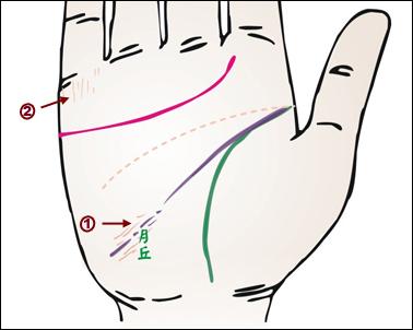 智慧線斜走月丘,中有斷口,并帶模糊的細(xì)小雜線,多是膀胱結(jié)石。尾指根處現(xiàn)出多條短縱線,多是膀胱疾患。