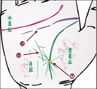 感情線上有許多細(xì)短線橫切。水星丘脹高,多縱橫小紋且模糊不清。此處的感情線通常較薄或有斷口。健康線含糊而淺,有岔線。金星丘或月丘發(fā)紅,有紅、紫、茶色斑點(diǎn)。