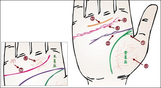 生命線始端分岔,表示過(guò)去首有胸部疾患。智慧線有島,表示肺部功能較弱。金星帶平行感情線延伸,顯示支氣管炎為慢性,久咳不止。感情線末端呈穗狀,表示易患胸膜炎。金星丘有很多小紋,是筋力衰弱及肺弱之徵。中指下方感情線中央部有島,說(shuō)明過(guò)去曾患過(guò)肺炎。尾指根有縱紋,表示胸廓狹而支氣管弱。土星丘有細(xì)亂線,煩示容易起咳。