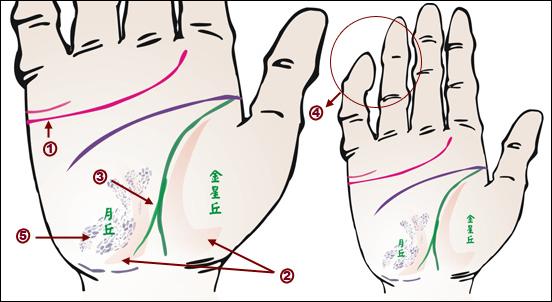 掌肌滑溜溜的,多有風(fēng)濕病。手指關(guān)節(jié)腫而痛。感情線起點(diǎn)處成雙,多有痛風(fēng)。金星丘、月丘的隆起肌肉很瘦薄,筋力不足。生命線末端分叉成兩股,末端擴(kuò)散,表示風(fēng)濕晚期行走有問(wèn)題。尾指、無(wú)名指不能自由屈伸,老是彎曲,是風(fēng)濕性神經(jīng)麻痹。手腕周?chē)皆虑鹣拢霈F(xiàn)暗紫黑斑,通常是風(fēng)濕癥腰部障礙,腳踝內(nèi)側(cè)也會(huì)呈現(xiàn)類(lèi)似色調(diào)。