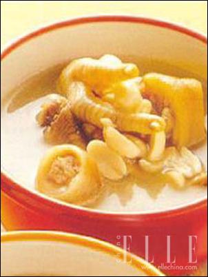 功效:豬尾和鳳爪皆含豐富的膠質(zhì),對豐胸很有助益,如果只喝湯,也很不錯(cuò)!