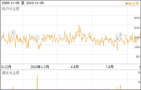 陳玉琴百度指數(shù),2010年5月28日,指數(shù)一度高達326點,11月5日,為240點