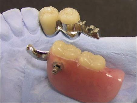 MK1精密附著體示意圖-2,是一個MK1的石膏模型。灰白色的,是正常的牙齒;與灰白相連的,是經(jīng)過了打磨并戴上牙瓷冠以后的健康牙齒,在這里成為基牙(換言之,就是要以這兩顆牙為基礎(chǔ))基牙伸出一個陰扣,與圖右下方的義齒體的陽扣相結(jié)合,義齒體通過一個小鑰匙轉(zhuǎn)動陽扣,與陰扣鎖住,從而將義齒體固定住。拆卸也很方便。