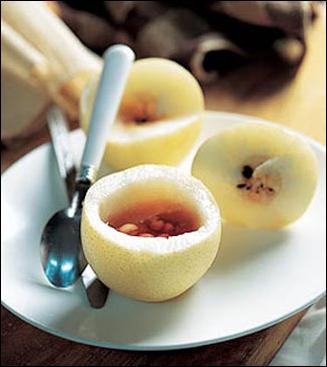 做法是將北杏10克,雪梨1個(gè),白砂糖30~50克,同放碗中,加適量清水,隔水蒸熟(1小時(shí))即成。喝湯吃梨,常食有效。