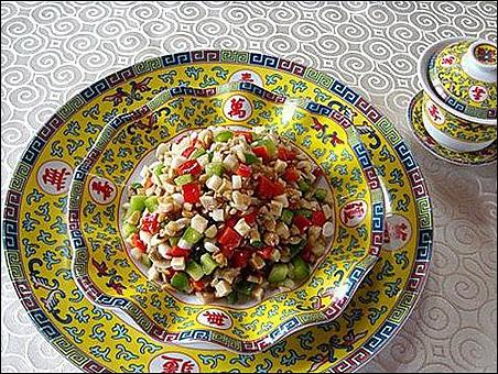 以茄子刨皮切碎,用雞油炸,另以雞肉、香蕈、蘑菇、筍、五香豆腐干,各色干果子皆切丁,用雞湯煨干;香油炒過,外加糟油拌,收入瓷罐封嚴(yán)。食時用“炒的雞爪子一拌就是了”。