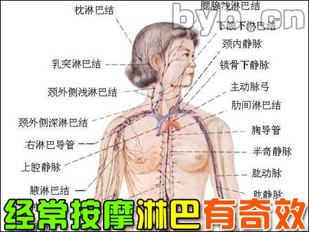 中醫(yī)說(shuō)起按摩來(lái),大都會(huì)與經(jīng)絡(luò)聯(lián)系在一起.而對(duì)于現(xiàn)代醫(yī)學(xué)而言,這里不能不提及人的淋巴系統(tǒng).下面這張圖,就是人體淋巴系統(tǒng)分布示意圖.大家看看,是不是分布于人的全身呢?對(duì).一定是這樣的.說(shuō)起淋巴系統(tǒng),它在身體里到底起什么作用呢?