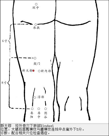 位置描述:如上圖,新大郄穴位于大腿后側(cè)承扶穴與委中穴連線(xiàn)中點(diǎn),外開(kāi)5 分下5 分(同身寸)處;新內(nèi)郄穴位于承扶穴與委中穴連線(xiàn)中點(diǎn),內(nèi)開(kāi)5 分,下5 分(同身寸)處。 由于這一對(duì)穴對(duì)診斷癌癥和腫瘤有很大的幫助,因而又被稱(chēng)為“蓋氏穴”。
