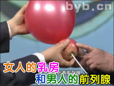 ★前列腺的位置。下面這張圖,截選自BTV養(yǎng)生堂的一期節(jié)目,上面的氣球,就是人的膀胱,而中間的蘋果,就是前列腺,吸管剛好穿過蘋果和氣球聯(lián)接。這張圖清楚地表明了前列腺的位置。