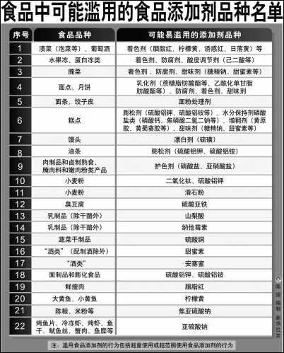 國務(wù)院食品安全委員會辦公室公布的食品中可能濫用的食品添加劑品種名單。