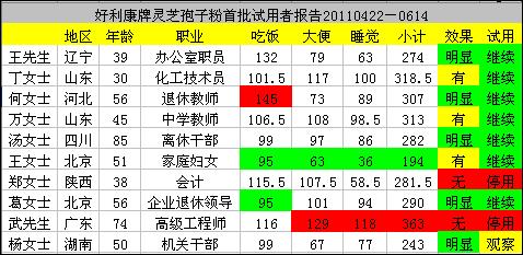 首批好利康牌靈芝孢子粉試用匯總表
