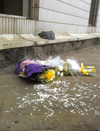 昨日,人大科研樓二層平臺(tái)的事發(fā)處,放著幾束菊花。