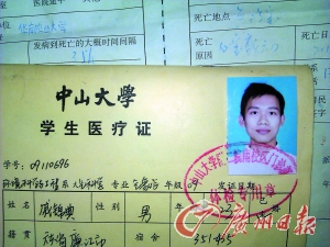 “太可惜了,明天就是他26歲的生日了!” 昨日下午,從廣東湛江趕來的戚錦典的親屬默默凝視著他的死亡醫(yī)學(xué)證明書說。昨日,他們將戚錦典的遺體送至中山大學(xué)法醫(yī)鑒定中心進(jìn)行尸檢,家屬認(rèn)為負(fù)責(zé)救治的醫(yī)院在治療過程中有過失,導(dǎo)致了戚錦典的死亡。