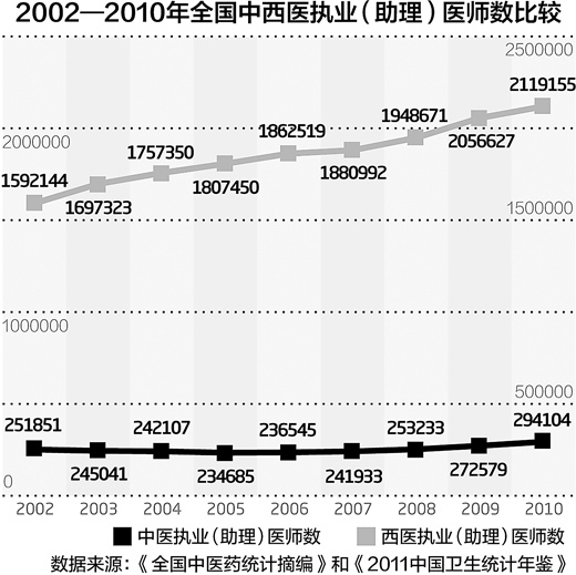 “據(jù)我所知,以后幾屆畢業(yè)的學(xué)弟學(xué)妹們,在中醫(yī)行業(yè)就職的比例就更低了?!毙∥浜敛谎陲椫嗅t(yī)學(xué)生“兩頭受堵”的就業(yè)困境,“西醫(yī)醫(yī)院基本不招中醫(yī)學(xué)生,但是中醫(yī)招聘也不以中醫(yī)學(xué)生為主,這叫我們上哪兒工作去?”據(jù)了解,小武班上不少同學(xué)本科畢業(yè)后就去讀了西醫(yī)研究生、做了西醫(yī)醫(yī)生,還有一些同學(xué)干脆改行。從2002年至2010年,中醫(yī)執(zhí)業(yè)(助理)醫(yī)師數(shù)增加了42253人,這個增幅,還不到西醫(yī)的1/12。