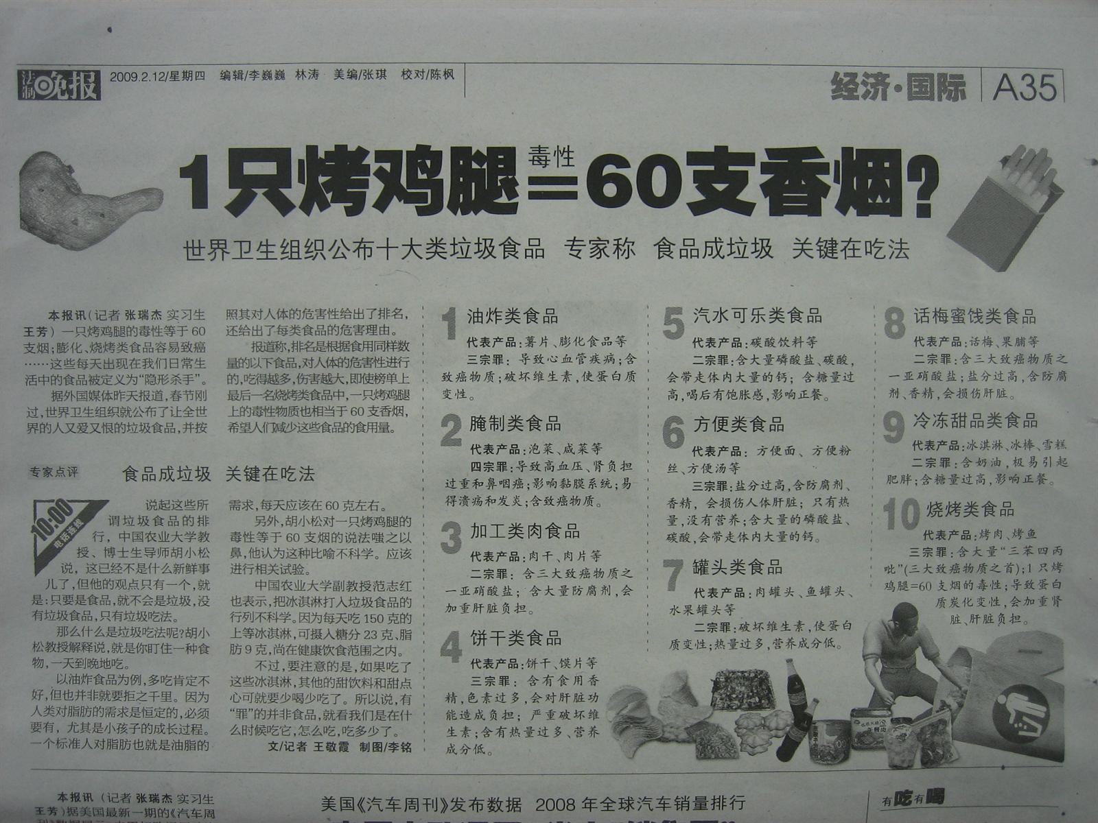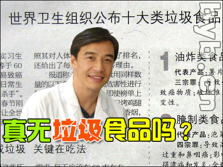 ??????? 想必以上的名單,廣大網(wǎng)友不止一次的看到過(guò)。下面這張圖是昨天《法制晚報(bào)》刊發(fā)的文章。其中,記者在采訪時(shí),北京農(nóng)業(yè)大學(xué)教授胡小松的一番話,令人頗感疑惑,他最著名的言論是:世界上沒(méi)有垃圾食品,只有垃圾吃法。但事實(shí)真是這樣嗎?難道世界衛(wèi)生組織也搞錯(cuò)了嗎?下面,我們看看胡小松的背景資料和言論觀點(diǎn)。