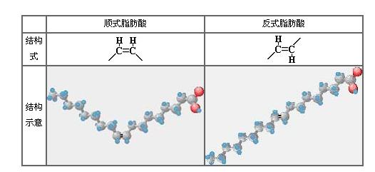 不飽和脂肪酸根據(jù)碳鏈上氫原子的位置,又可以分成兩種,如果氫原子都位于同一側(cè),叫做“順式脂肪酸”,鏈的形狀曲折,看起來象U型;如果氫原子位于兩側(cè),叫做“反式脂肪酸”(trans-fattyacids),看起來象線形。