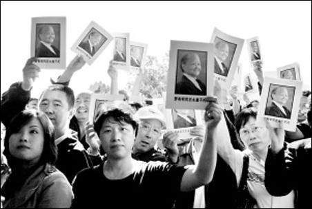 八寶山蘭廳外的臺階上,早已走過了一列又一列沉重的腳步。排排潔白的花圈和挽聯(lián)佇立于道路兩旁,簇?fù)碇磕钫?見圖)。人們胸前皆佩戴著白花,含淚低頜,沉靜的肅穆湮沒了整個蘭廳。