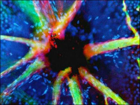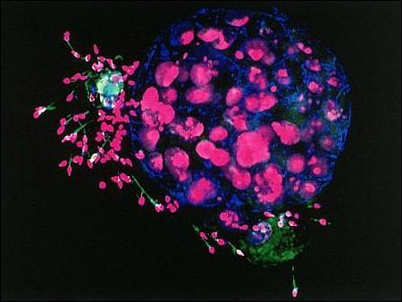 這看起來(lái)像個(gè)戰(zhàn)事不斷的世界,但事實(shí)上它是一個(gè)受精5天后的卵子,一些精細(xì)胞仍粘貼在它表面。這張色彩艷麗的美麗圖片,是利用共聚焦顯微鏡拍攝的。胚胎和精細(xì)胞核呈紫色,而精子的尾巴是綠色。藍(lán)色區(qū)域是縫隙連接(gap junction),它們把細(xì)胞彼此聯(lián)系在一起。