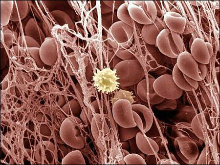 還記得你剛剛看到的形狀統(tǒng)一的紅血球圖片嗎?這張圖看起來(lái)像是紅血球粘在了粘性網(wǎng)上,形成血液凝塊。位于中間的那個(gè)細(xì)胞是白血球。