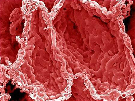 這張彩色圖片顯示的是人類肺部?jī)?nèi)表面。圖中的洞穴是肺氣泡,這里是血液交換氣體的地方。