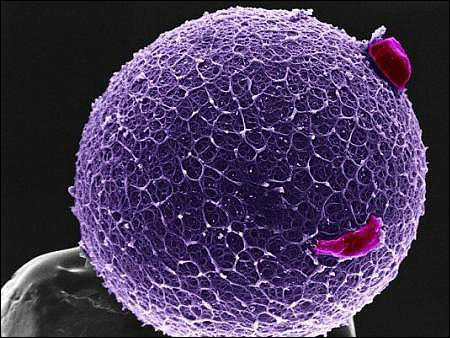 這張彩色圖片上的紫色人類卵子坐落在一個(gè)柱狀物上。它上面包裹一層透明帶狀物——醣蛋白,這種物質(zhì)既具有保護(hù)卵細(xì)胞的作用,又能誘捕和限制精子。兩個(gè)紅色冠細(xì)胞粘貼在透明帶狀物上。