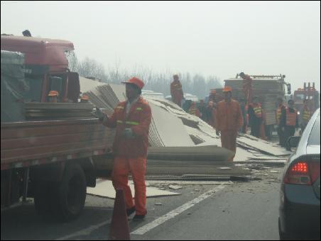 等我們開到跟前才發(fā)現(xiàn),一輛拉著板材的大貨車從對面車道上沖破隔離帶,騎在了上面,板材撒滿了一地,把雙方向的車道全堵住了。尤其是從北京往天津方向的三條道,被占了兩條,你說能不堵嗎?