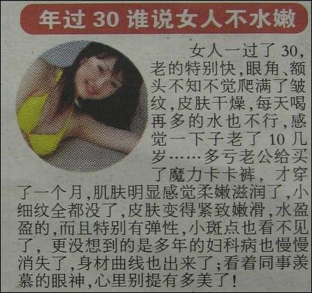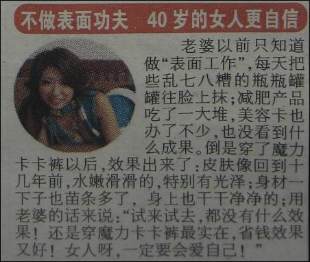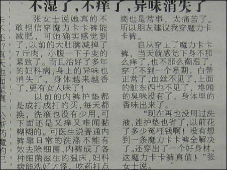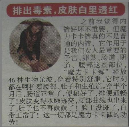 【byb.cn XJ】 3.15剛過,虛假廣告又卷土重來。這不,3月21日的《法制晚報》,又拋出一系列的虛假廣告,其中最引人注目的就是魔力卡卡褲,聲稱能解決所有婦科疾病。