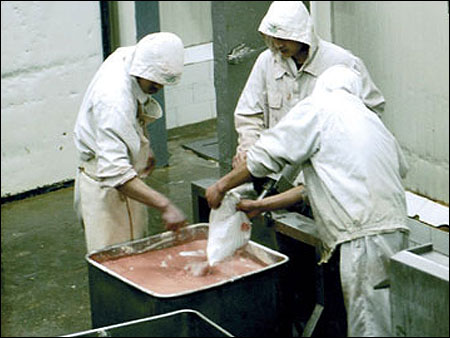 工人正在選修,剔除肉塊筋膜。