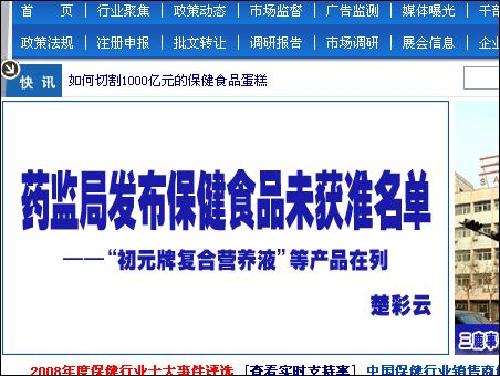 從表中我們還以看到一個(gè)非常熟悉的名字"初元牌復(fù)合營養(yǎng)液”。近年來,"看病人,送初元”的廣告不斷充斥于耳,據(jù)了解目前大做廣告的初元牌復(fù)合營養(yǎng)液并不是經(jīng)過審批的保健食品。據(jù)業(yè)內(nèi)人士披露:"初元”其實(shí)隱喻的是"出院”,與其廣告語有"異曲同工”之意,卻隱借了保健品的內(nèi)涵大肆宣傳,這無疑會(huì)誤導(dǎo)消費(fèi)者將其當(dāng)作保健食品購買,而此類產(chǎn)品(未獲得保健食品批準(zhǔn)文號)在市場中還大有所在。