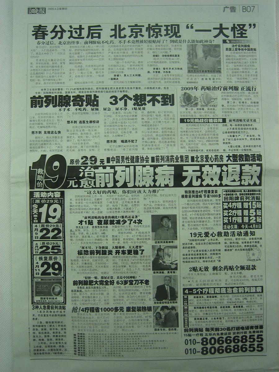 2009年4月2日《法制晚報》B07版前列消貼虛假廣告
