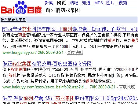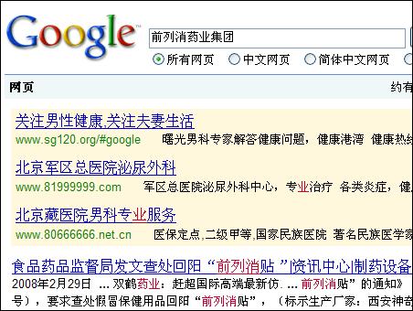 我們在這張整版的廣告上,查不到回陽牌前列消貼是由哪家公司生產(chǎn)的。更在網(wǎng)上查不到相應(yīng)的網(wǎng)址和電話?!扒傲邢帢I(yè)集團”更是子虛烏有。下面是我們分別在百度和GOOGLE上搜索的截圖。而且“中國男性健康協(xié)會”,也根本搜索不到。到底有沒有這個協(xié)會,我們都無法得知。