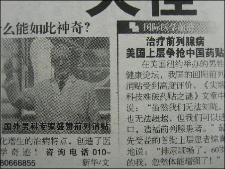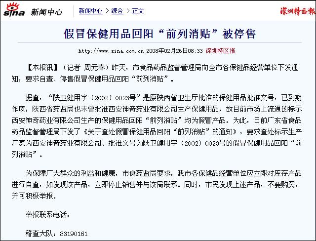 正文:假冒保健用品回陽“前列消貼”被停售http://www.sina.com.cn 2008年02月26日08:33 深圳特區(qū)報http://news.sina.com.cn/o/2008-02-26/083313476730s.shtml