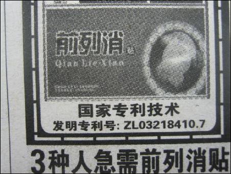廣告上注明,回陽牌前列消貼是國家專利技術(shù),并且給了發(fā)明專利號:ZL03218410.7,我們上網(wǎng)查了一下,確實有這個專利,但不屬于發(fā)明專利,而是實用新型專利。發(fā)明專利和實用新型專利分量完全不同。廠商告知有發(fā)明專利,其實屬于混淆概念。退一萬步說,即使有專利,沒有國家批準的文號,一樣是賣假藥。