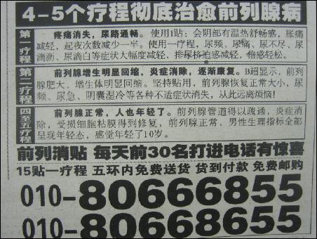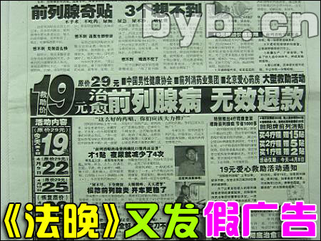 【byb.cn XJ】 現(xiàn)在騙子實在是太多了,而虛假的醫(yī)療廣告更是數(shù)不勝數(shù)。而我們的媒體,卻缺少社會責任感,助紂為虐,這不,4月2日的北京《法制晚報》第B07版,再出虛假醫(yī)療廣告:19元治愈前列腺疾病 無效退款。