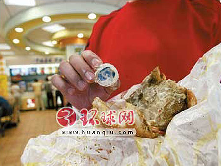 徐先生夫婦2005年在馬連道肯德基餐廳吃黃金烤雞腿堡時,吃出了一只瓶蓋。 “幸虧我反應及時沒有咽下去,否則卡在食道里就危險了?!毙煜壬f。該餐廳經(jīng)理承認這只漢堡內(nèi)有異物是店方的責任。“瓶蓋是用來噴醬的噴槍頭,有可能槍頭松動連醬料一同噴進了漢堡內(nèi)未被發(fā)現(xiàn)。”